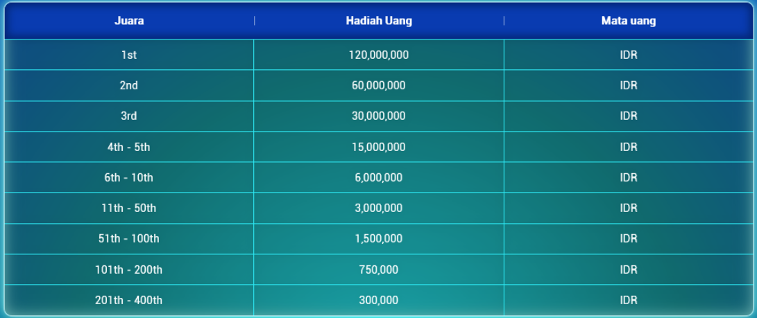 Dengan total hadiah spektakuler senilai IDR 600.000.000, kesempatan emas terbuka lebar buat 400 pemenang terbaik! Cukup dengan deposit minimal Rp10.000 dan taruhan Rp15.000 per putaran, kamu sudah bisa kumpulin poin dan masuk ke papan peringkat. Semakin banyak spin, semakin besar peluangmu menempati posisi teratas!