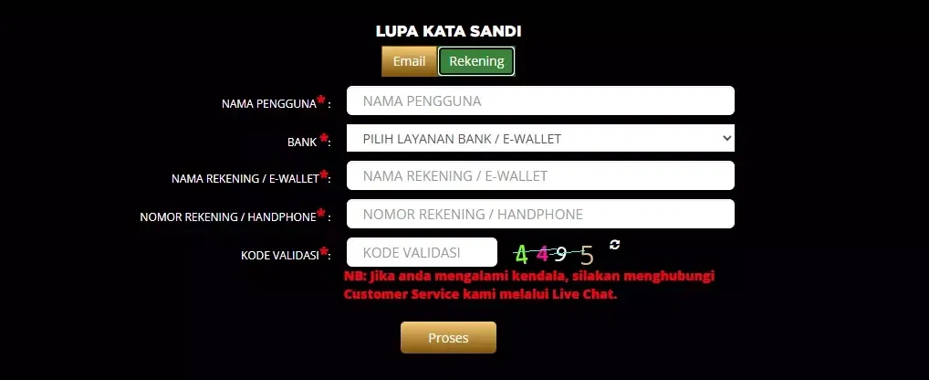 Harap mengisi data form Lupa Kata Sandi sesuai saat anda mendaftar ID anda. Setelah semua data yang anda isi telah benar pada saat anda tekan "Proses". Selanjutnya permintaan Lupa Kata Sandi akan diproses oleh sistem dan anda akan diberikan Kata Sandi baru